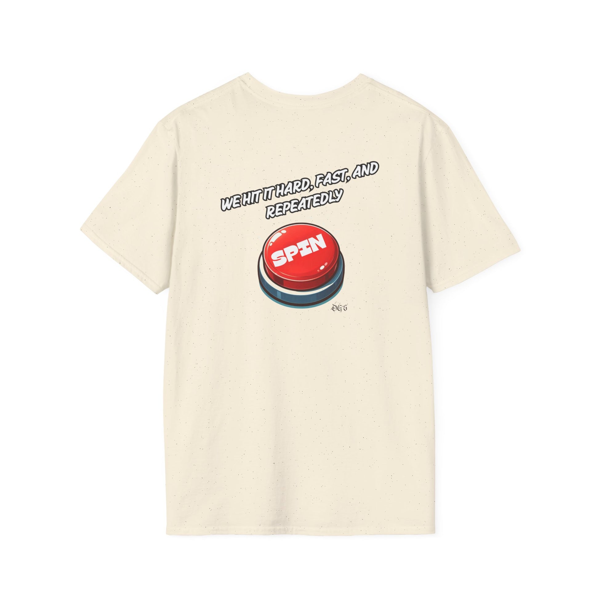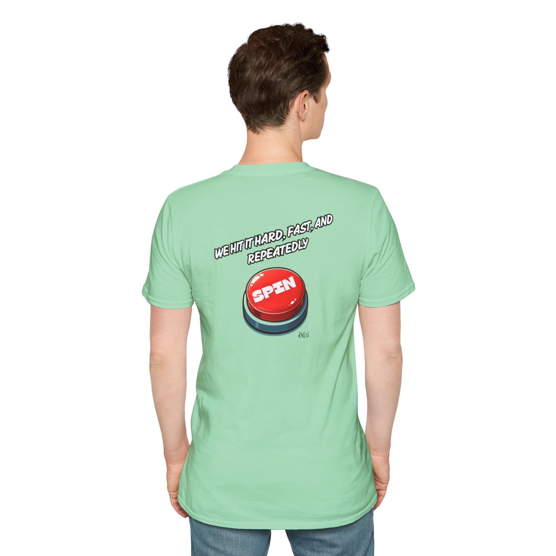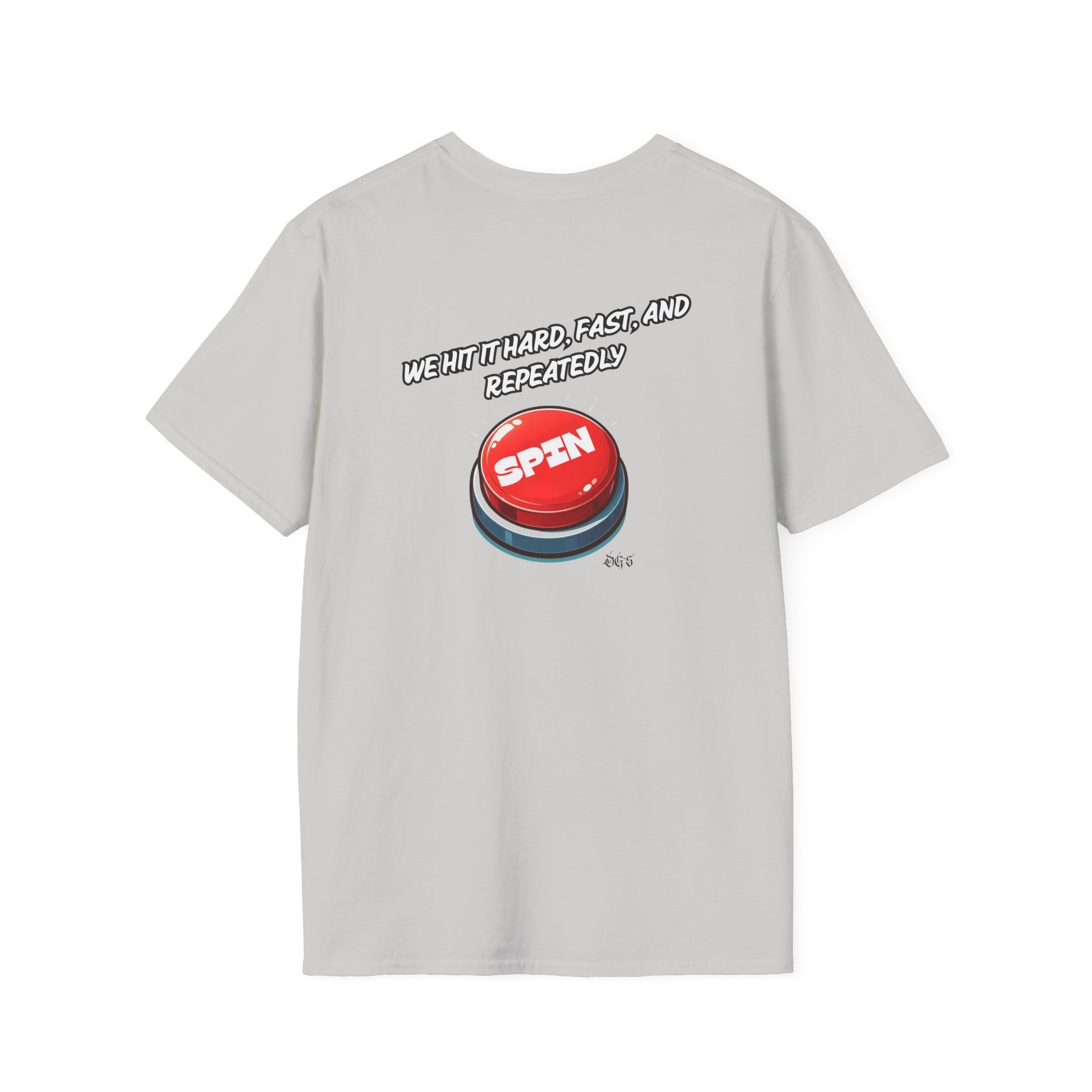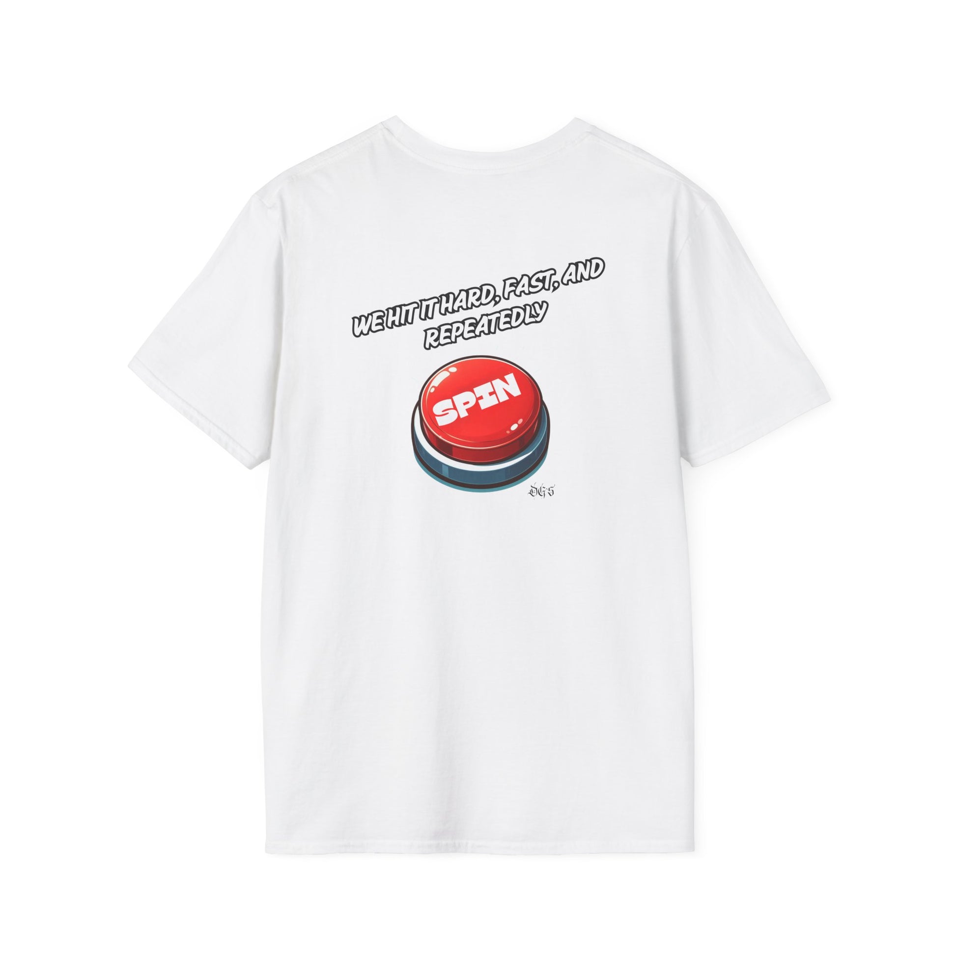 A flirty and fun unisex T-Shirt featuring a funny quote related to gambling and spinning to win. This softstyle T-Shirt is perfect for casual outings or lounging at home. Ideal for adults who enjoy humor and casual wear. Relevant for casual events, game nights, or themed parties.